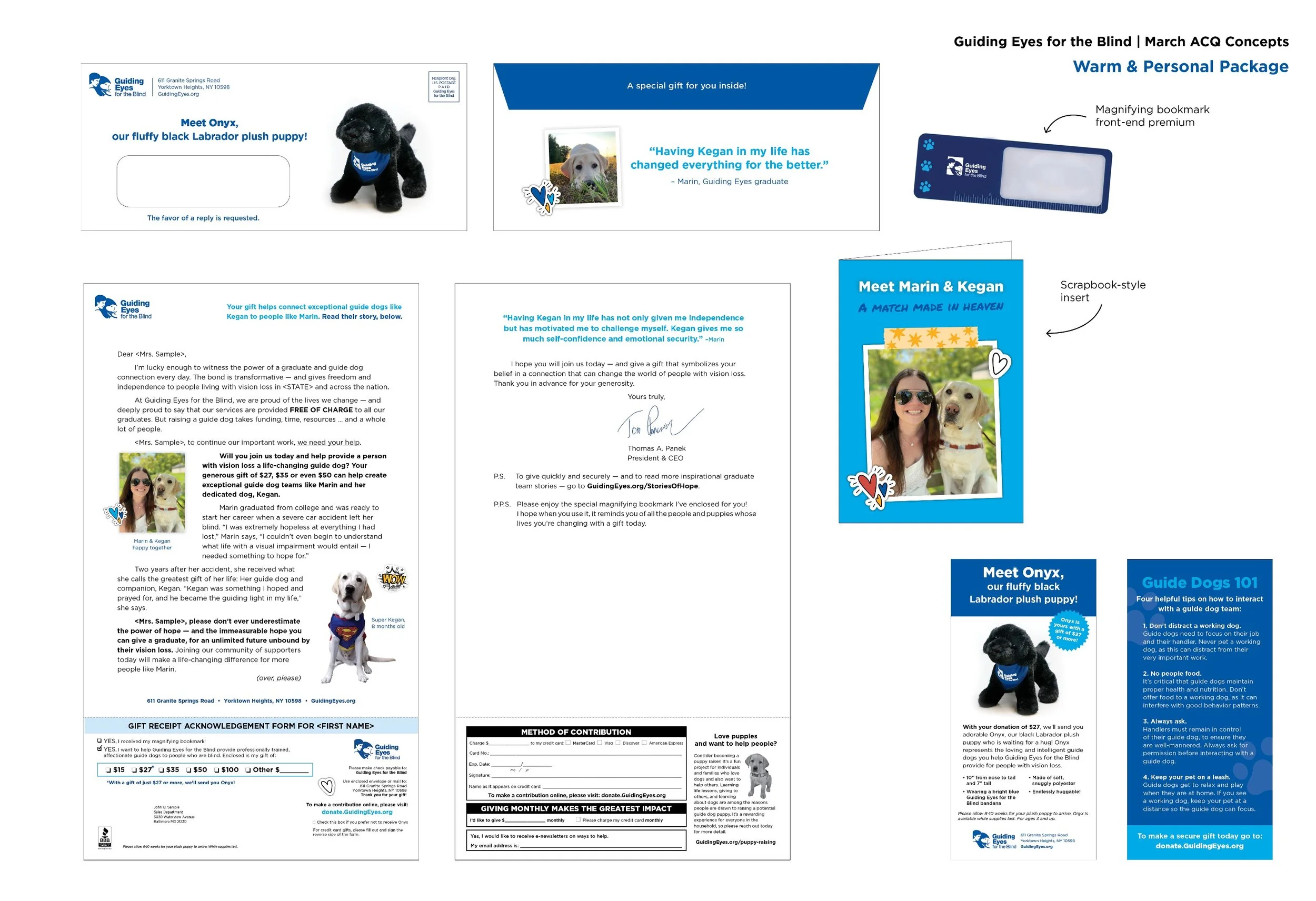 Faced with a declining acquisition program, Guiding Eyes for the Blind challenged us with creating two new direct mail package concepts to help bring new donors into the fold. In the end, they bought both.
